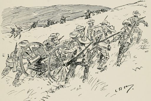 Find we're to act as rearguard to something. Got told off to occupy a bit of a wood right away on the flank. Thank goodness they haven't told me what to do or how long to hold on, or anything, so I shall get out of touch as soon as I can and play off my own bat. Rather good little wood. Men awfully keen on the job. Soon after we occupied position, spotted party of the enemy coming through gap in the hills. Couldn't see them very well on account of the haze, so waited till they got fairly near, and then gave 'em a volley. They sent an orderly over to know what the deuce I meant by firing on the ambulance. Felt rather an ass, but found out afterwards every party they had passed had paid them the same compliment. Soon after scout came in with news of enemy. I wanted to ambush 'em, but some silly fool fired without orders, so it became a regular attack. Put three companies out of action before we retired, but cut it rather too fine, and a few of my chaps got collared. Found the rest of the rearguard had cleared before. Some of 'em mistook us for the bally foe, and blazed into us like old boots. Rotted 'em no end when we got up to them. Everything got in the most awful muddle after a bit; no one knew who was which. After the "Cease fire" sounded came across a lot of chaps firing like mad at anybody who came near. Told 'em the "Cease fire" had gone. "'Cease fire' be damned!" said one of them. "We ain't had a look in till now!"