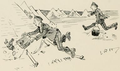 Tuesday.—My day as Tent Orderly. I never see such a lot of chaps to grumble as our tent. Fust of all the bread warn't right, then I 'adn't got enough coffee, an' the bacon was done too much—why 'adn't I kicked up a row? "Look 'ere," I ses, "you bloomin' well take wot you gets, an' if you aint satisfied you complain to the off'cer of the day; 'e won't stand much of yer lip. I know my work," I ses, "an' I done it."