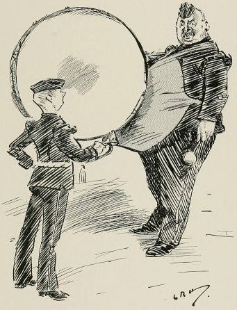 "But now, along comes the General. 'Th' Army's not big enough,' 'e ses. 'we must 'ave more men or I won't be responsible for breakages,' 'e ses. 'Serious?' ses the Gov'mint. 'Very,' ses the General. 'What am I to do?' ses the Gov'mint. 'Conscrip,' ses the General. 'I daren't,' ses the Gov'mint in a whisper; 'the Opposition 'ud get in at the next election.' 'The country requires it,' ses the General. 'Does it?' ses the Gov'mint. 'It requires us more; it would be as much as my place is worth to ask every man to do his duty, an' besides, there's me brave and devoted Volunteers.' 'They'll never be any real good till they have the M'litia Ballot be'ind 'em,' ses the General. 'They're asking for it themselves,' ses he. 'Never will I consent to force any one,' ses the Gov'mint, 'in this Land of Freedom.' 'Something must be done,' ses the General. 'Ah,' ses the Gov'mint, 'I have it! Crowd them—I mean the Volunteers—for all you're worth, an' if anything busts, we can throw the blame on them. Increase the work an' cut down the pay, 'tis a sound business principle. Now to turn to more important questions. Is the new cap to have a peak, or is it not? An' who is it to be named after?'"