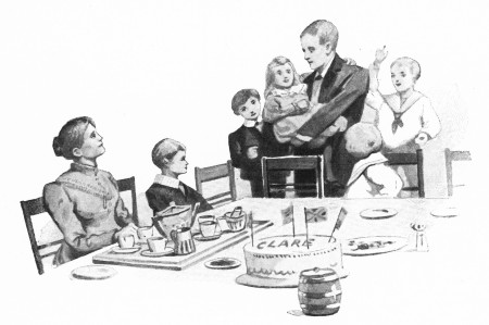 On the table was a huge frosted white cake, with flags flying and "CLARE" in great letters upon it, while Mother, who had grown pounds better lately, smiled behind the army of cups and saucers.