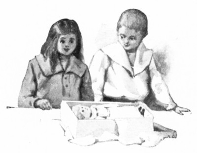 The children found their Mother and Uncle Percy sitting by the fire talking busily. What they were saying neither Mollie nor Geoffrey heard; they were too busy to listen, for on the table lay an open cardboard box, and in the box lay a lovely doll—blue eyes, pink cheeks, golden hair, dressed in the prettiest of dresses and cleanest of pinafores.