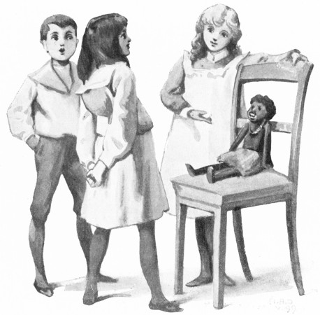 "The gardener found him in the garden," said Bessie, as Geoffrey and Mollie stared at Bessie's new doll. "Someone must have thrown him away, for he was ragged and torn; but Mother mended him, and, though he's queer, I like him the best of all my dolls."