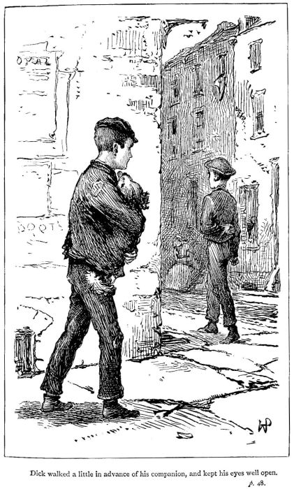 Considerably frightened, as Jenks intended she should be, Flo tumbled to her feet, and the three children walked away. Dick nudged his sister and looked intensely mysterious, his bright eyes were dancing, his shock of rough hair was pushed like a hay-stack above his forehead, his dirty freckled face was flushed. Jenks preceded the brother and sister by a few steps, getting over the ground in a light and leisurely manner, most refreshing to the eyes of Dick.