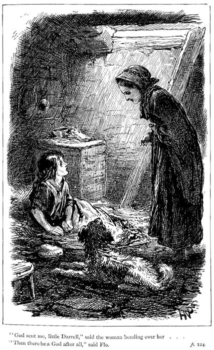 “Oh! ’ee is starvin’, I must give ’im one bite o’ my supper,” said Flo, her little heart utterly melting, and then the knowing animal came closer, and crouched at her feet.