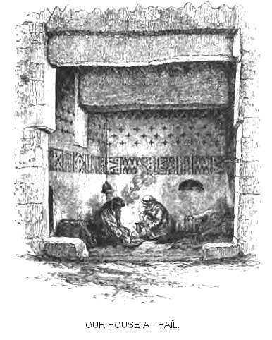 We found a double house provided for us in the main street of Haïl, and not two hundred yards from the kasr—a house without pretence, but sufficient for our wants, and secure from all intruders, for the street door could be locked, and the walls were high. It consisted of two separate houses, as I believe most dwellings in Arabia do, one for men and the other for women. In the former there was a kahwah and a couple of smaller rooms, and this we gave over to Mohammed and the servants, keeping the harim for ourselves. This last had a small open court, just large enough for the three mares to stand in, an open vestibule of the sort they call liwan at Damascus, and two little dens. In one of these dens we stored our luggage, and in the other, spread our beds. The doors of these inner rooms could be locked up when we went out, with curious wooden locks and wooden keys; the doors were of ithel wood. All was exceedingly simple, but in decent repair and clean, the only ornaments being certain patterns, scratched out in white from the brown wash which covered the walls. Here we soon made ourselves comfortable, and were not sorry to rest at last, after our long journey.