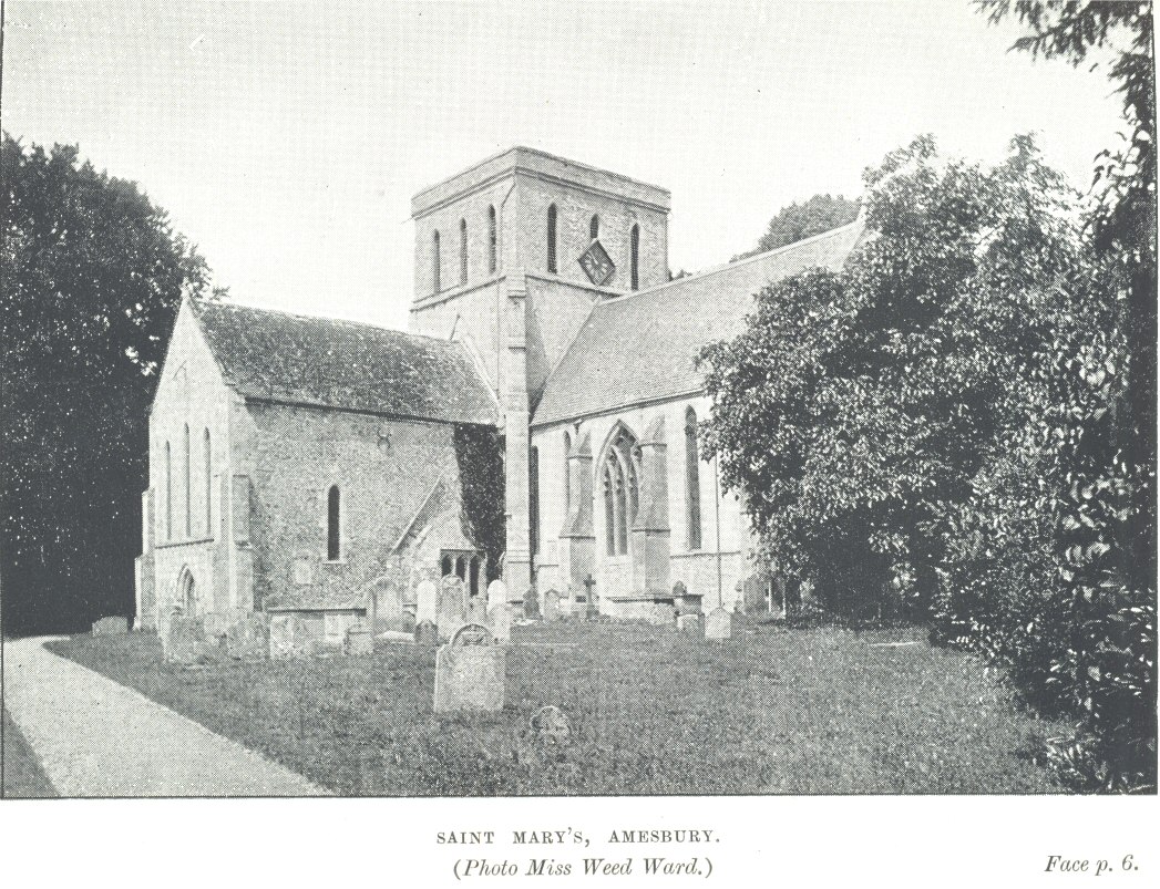 Amesbury lies eight miles north of Salisbury, and we may consider that it occupies a space in the midst of that vast tract of undulating country that (somewhat erroneously to my mind) is given the name of “Salisbury Plain.” I now propose to trace, as briefly as I can, some of the history of this interesting and beautiful place. Its antiquity is so great as to take us back to pre-historic times. In its near neighbourhood many desperate battles were fought between Briton, Saxon, and Roman with varying success. Lewis, in his ancient History of Britain, says: “In the reign of Vortigern, 461 A.D., a Conference was appointed to take place near the Abbey of Ambri, with Hengist the Saxon, and it was agreed that both parties should come without armour. But Hengist, under colour of peace, devised the subversion of all the nobility of Britain, and chose out to come to this assembly his faithfullest and hardiest men, commanding every one of them to hide under their garment a long knife, with which, when he should give the watchword, every one should kill the Briton next him. Both sides met upon the day appointed, and, treating earnestly upon the matter, Hengist suddenly gave the watchword and caught Vortigern by the collar, upon which the Saxons, with their long knives, violently murdered the innocent and unarmed Britons. Thus were 460 earls and noblemen of the Britons treacherously murdered. They were buried in the convent at Amesbury. This massacre took place near Stonehenge, where repeated battles were fought between Ambrosius and Hengist.” [10]