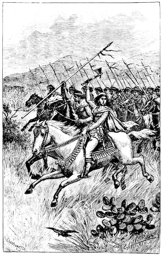 A tall figure, riding a barebacked horse, suddenly confronted Aniwee, and made a thrust at her with a short spear. She parried the thrust, and pulling up her horse with a movement of anger, stood up in her stirrups, and waved her axe round her head defiantly. But the weapon almost fell from her grasp as, beneath his Cristianoâs apparel, she recognised Inacayal, and became aware with whom she was dealing.