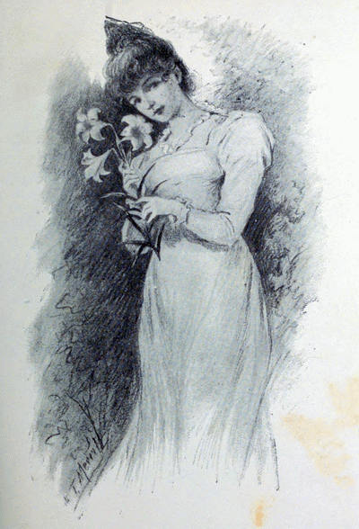 “THE LONG WHITE LILY—PUTTING IT DELICATELY TO HER CHEEK.”