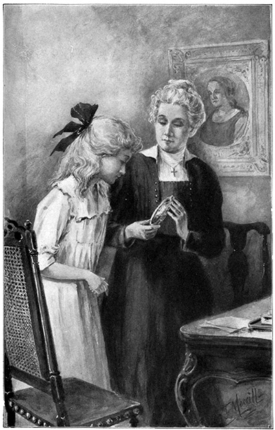 Shaking her head sadly, Honor opened a cupboard door, and with careful hands drew out—certainly, two of the most beautiful dolls that ever were seen. Maman had chosen them with her own exquisite taste, in Paris and Rome. Angélique, the Parisian maiden, was blonde as Patricia herself, with flaxen hair and eyes of real sky-blue; Fiordispina, on the other hand, might almost stand for Honor’s dream-self. Her hair did not reach the ground, much less lie in silken piles on the velvet carpet, but it was long enough to braid, and it was real hair: moreover it was hair with a story to it. Maman had bought it in Rome, from a woman whose daughter had just entered11 a convent, and had her beautiful hair cut off. The woman wept, and assured Mrs. Bright that there was no such hair in Rome. Most of it had been purchased by two noble Princesses whom age had deprived of their own chevelure; there was but this little tress left. She had thought to preserve it as a memento of her child, but for the puppazza of so charming a donzella as the—finally—she named a price, and Fiordispina received her head of hair, in place of the bit of fuzzy lamb’s wool which had disfigured her pretty head.