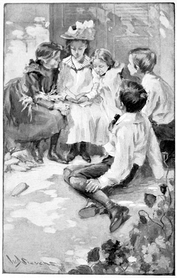 Mrs. Hart sat at her window, sewing her seam and listening to the music she loved best, the music of children's voices. There were five of them, her own three and the two Penroses; and they were all sitting on the broad door-step, husking sweet corn and talking. Sue had just come over; she had been helping Katy, who had a lame arm. She looked pale and grave, for the adventure of two days before seemed still very near; yet her eyes were full of light as she looked from one to the other of the children, gazing as if she could not get her fill. Now and then she and Mary held out a hand and exchanged a silent squeeze that meant rivers of speech; but somehow Tom seemed to be doing most of the talking.