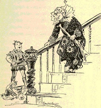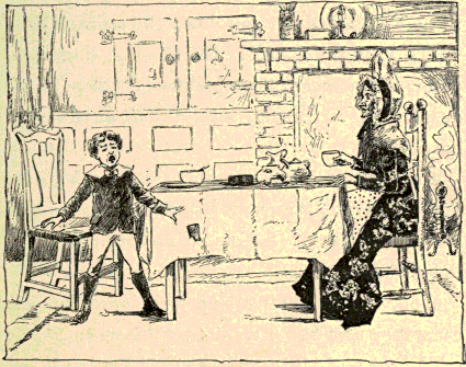 But the grandmother had other troubles beside dropping her ball. Toto was a very good boy,—better, in fact, than most boys,—and he loved his grandmother very much indeed; but he was forgetful, as every child is. Sometimes he forgot this, and sometimes that, and sometimes the other; for you see his heart was generally in the forest, and his head went to look after it; and that often made trouble. He always meant to get before he went to the forest everything that his grandmother could possibly want while he was away. Wood and water he never forgot, for he always brought those in before breakfast. But sometimes the brown potatoes sat waiting in the cellar closet, with their jackets all buttoned up, wondering why they were not taken out, as their brothers had been the day before, and put in a wonderful wicker cage, and carried off to see the great world. And the yellow apples blushed with anger and a sense of neglect; while the red apples turned yellow with vexation. And sometimes,—well, sometimes this sort of thing would happen: one day the old lady was going to make some gingerbread; for there was not a bit in the house, and Toto could not live without gingerbread. So she said, “Toto, go to the cupboard and get me the ginger-box and the soda, that’s a good boy!”
