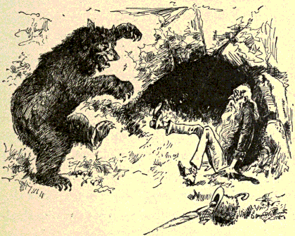 The squirrel took a flying leap, and alighted on Toto’s shoulder. At the same moment a louder rustling was heard, among the bushes this time, a sound of cracking and snapping twigs, and presently a huge black bear poked his nose out of the bushes, and sniffed inquiringly. “What’s up?” he asked. “I thought you fellows had gone home for the night, and I was just taking a nap.”