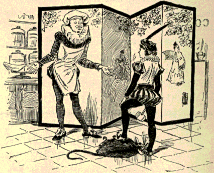 And he scratched three times on the floor. Almost immediately the head of a rat popped up through the hole. He was a huge rat, quite as large as a cat; but his size was no help to him, for as soon as he appeared, Hokey Pokey dealt him such a blow with his mallet that he fell down dead without even a squeak. Then Hokey Pokey called the confectioner, who came out from behind the screen and thanked him warmly; he also bade him choose anything he liked in the shop, in payment for his services.
