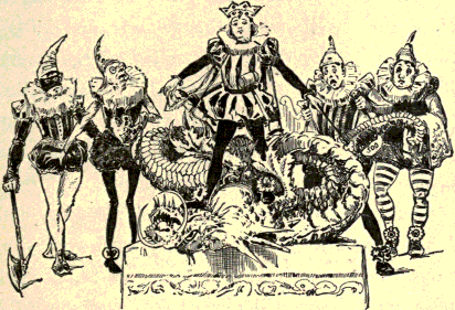 “Then the man on horseback lowered his lance, and let him pass in, and in short space he came before the mighty Dragon. The Dragon sat on a silver throne, with a golden knife in one hand, and a golden fork in the other. Around him were many people, who offered him dishes of every description; but he would none of them, for he had tasted them all before; and he howled with hunger on his silver throne. Then came forward Hokey Pokey, and said boldly,—
