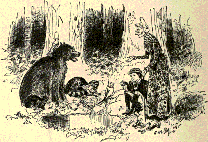 “Humph!” said the raccoon, waving his tail thoughtfully. “Why don’t you both come and live in the wood? She couldn’t be lonely here, you know; and it would be very convenient for us all. I know a nice hollow tree that I could get for you not far from here. A wild-cat lives in it now, but if your grandmother doesn’t like wild-cats, the bear can easily drive him away. He’s a disagreeable fellow, and we shall be glad to get rid of him and have a pleasanter neighbor. Does—a—does your grandmother scratch?”