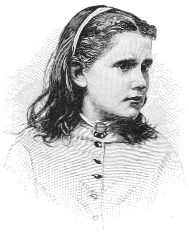 There were five of us. There had been six, but the Beautiful Boy was taken home to heaven while he was still very little; and it was good for the rest of us to know that there was always one to wait for and welcome us in the Place of Light to which we should go some day. So, as I said, there were five of us here,—Julia Romana, Florence, Harry, Laura, and Maud. Julia was the eldest. She took her second name from the ancient city in which she was born, and she was as beautiful as a soft Italian evening,—with dark hair, clear gray eyes, perfect features, and a complexion of such pure and wonderful red and white as I have never{14} seen in any other face. She had a look as if when she came away from heaven she had been allowed to remember it, while others must forget; and she walked in a dream always, of beauty and poetry, thinking of strange things. Very shy she was, very sensitive. When Flossy (this was Florence’s home name) called her “a great red-haired giant,” she wept bitterly, and reproached her sister for hurting her feelings. Julia knew everything, according to the belief of the younger children. What story was there she could not tell? She it was who led the famous before-breakfast walks, when we used to start off at six o’clock and walk to the Yellow Chases’ (we never knew any other name for them; it was the house that was yellow, not the people) at the top of the long hill, or sometimes even to the windmill beyond it, where we could see the miller at work, all white and dusty, and watch the white sails moving slowly round. And on the way Julia told us stories, from Scott or Shakspere; or gave us the plot of some opera, “Ernani” or “Trovatore,” with{15} snatches of song here and there. “Ai nostri monti ritornaremo,” whenever I hear this familiar air ground out by a hand-organ, everything fades from my eyes save a long white road fringed with buttercups and wild marigolds, and five little figures, with rosy hungry faces, trudging along, and listening to the story of the gypsy queen and her stolen troubadour.