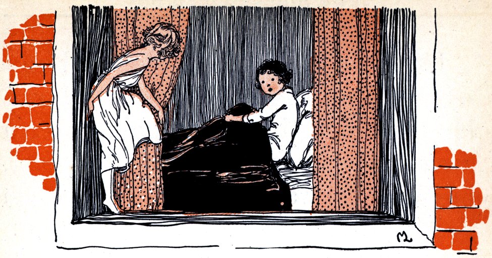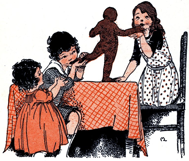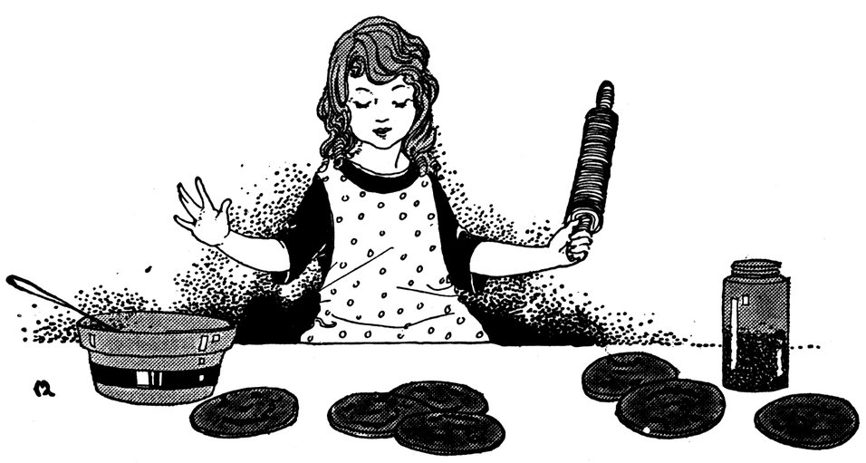 As Polly took the cookies out of the pan, she saw one was shaped like a regular boy, and before she could say a word, out he jumped and sat down on the ice box, fanning himself with a geranium leaf.
