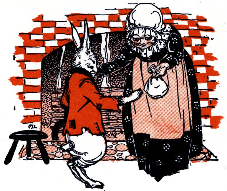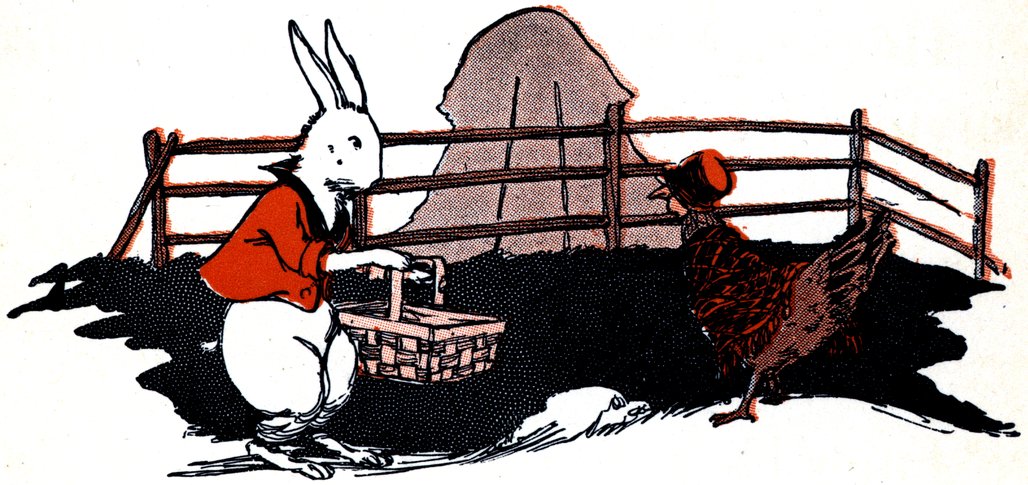 Just then a Funny Bunny came by with a hop, and a skip, and a bound 20and said, “Oh, Mother Tiny-Tail, no eggs for Easter, no eggs for the Tiny-Tails? That will never do!” So saying, he borrowed Mother Tiny-Tail’s market basket, and went hippety-hop to the Little Brown Hen who lives in the lane, saying: