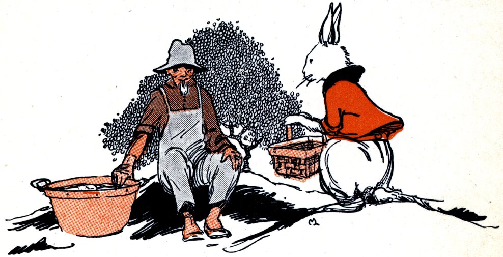 Then he ran with a hop, skip and jump to the Miller and bought a bag of meal. He took the meal to the Farmer and bought the corn. Then he took the corn to the Little Brown Hen, who lived in the lane, and she counted out one dozen, two dozen, three dozen, four dozen, five dozen beautiful white eggs. They filled the market basket Funny Bunny was carrying.