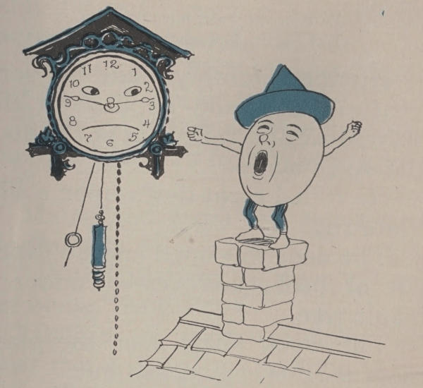 “Oh, ho! so you can talk, too,” said Humpty Dumpty. He climbed[114] up to the chimney of the play-house to see the clock better.