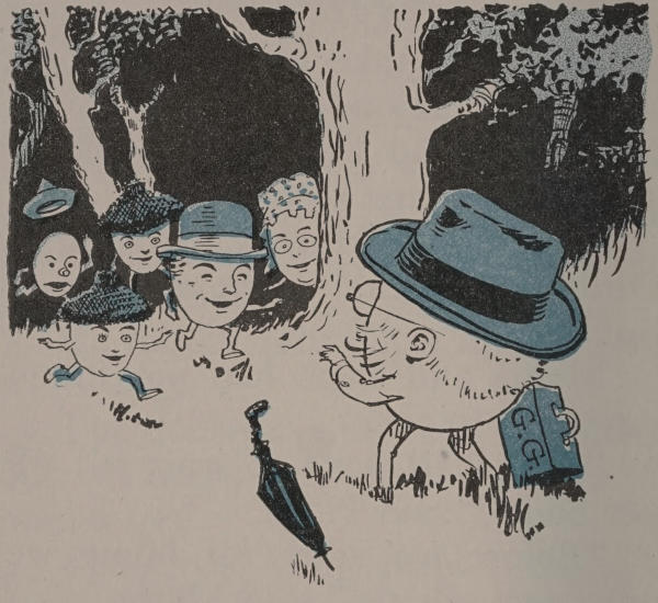When Grandpa Grimes heard the noise, he dropped his suit-case and he dropped his umbrella and cried: