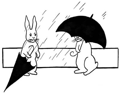 Bunny was delighted when Susan showed him how to open his umbrella, and they stood there some time, talking in the rain. Of course it was too wet to go for berries, but they wanted to have some fun, so they decided to go to Bunny’s house and blow soap-bubbles.