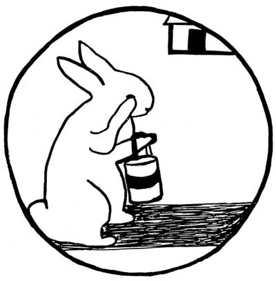 So she put up a nice little lunch for Bunny, and gave his coat an extra brush. She brushed him so hard that he cried a little, and went down the road with his dinner pail on his arm, brushing the tears away with his sore paw!