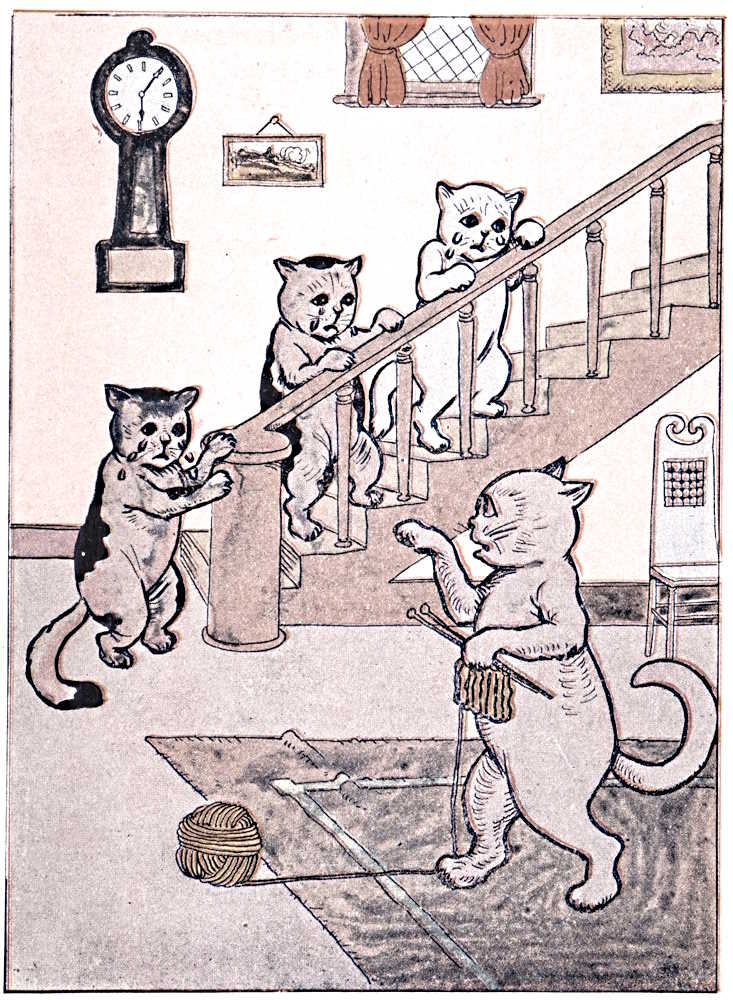 Old Mother Kit-Cat sat knitting as usual one evening and her needles went “click, click, click,” when “a rap-a-tap” was heard at the door and in walked Grandpa Growler saying,
