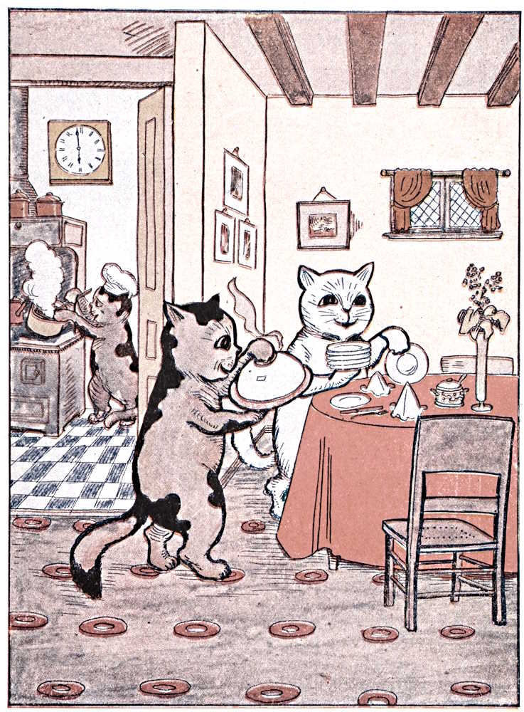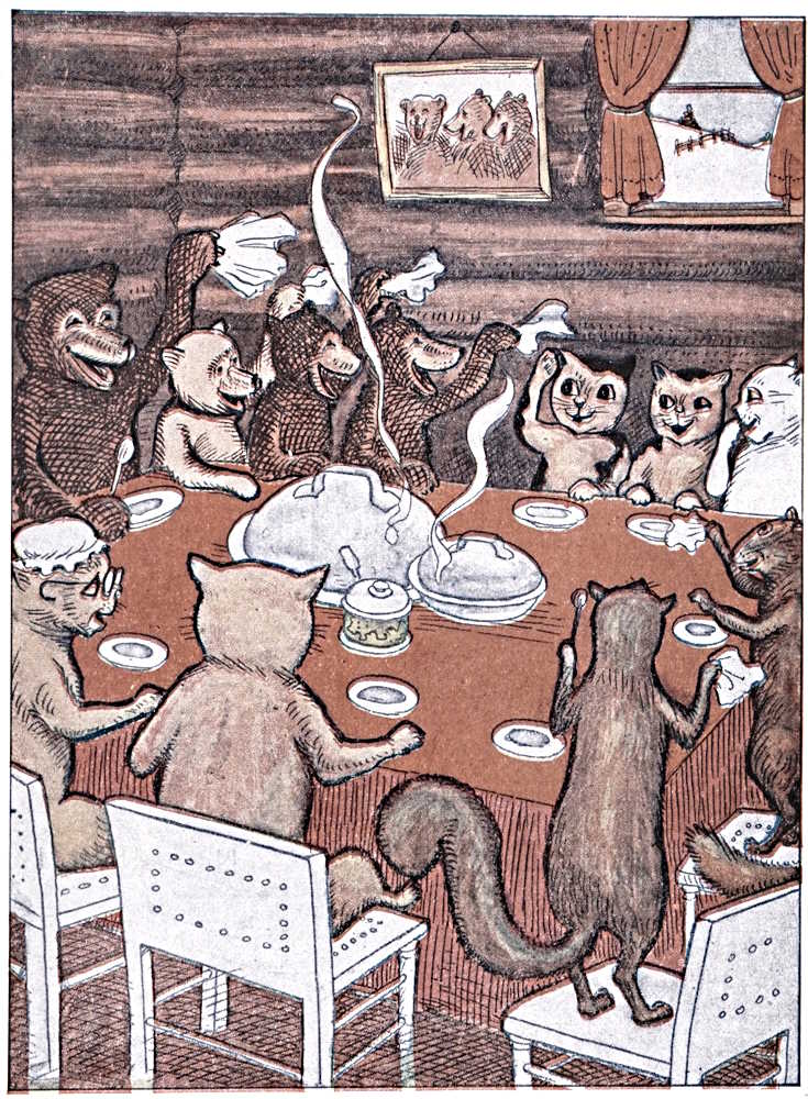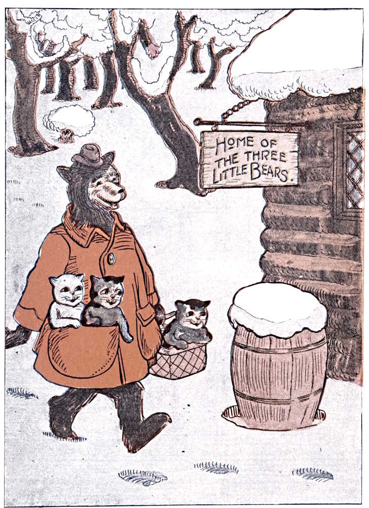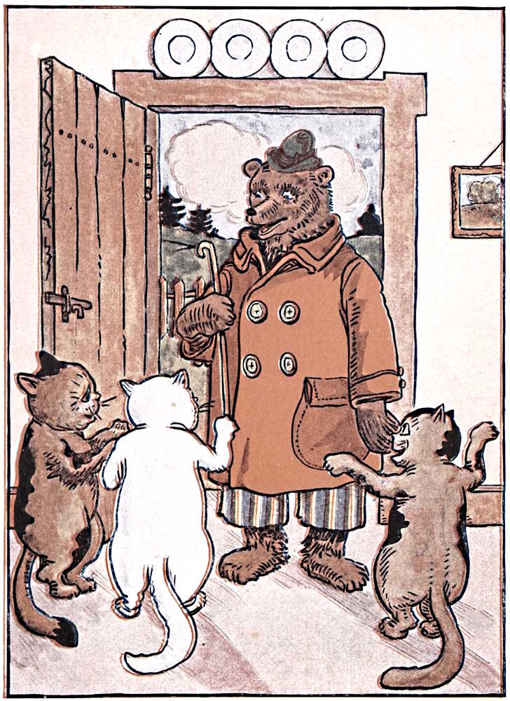 Old Mother Kit-Cat was wondering if he was really only joking about a surprise party when “rap-a-tap” was heard on the door and the Three Little Bears came in.