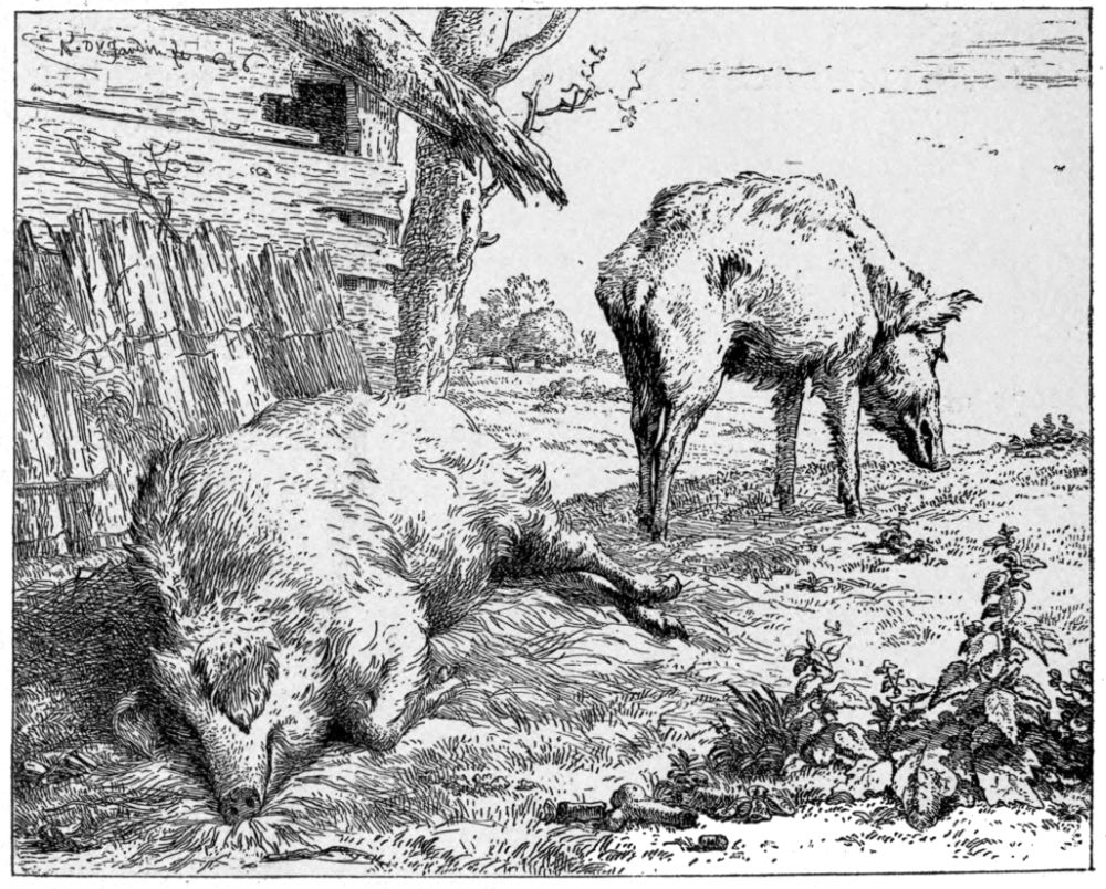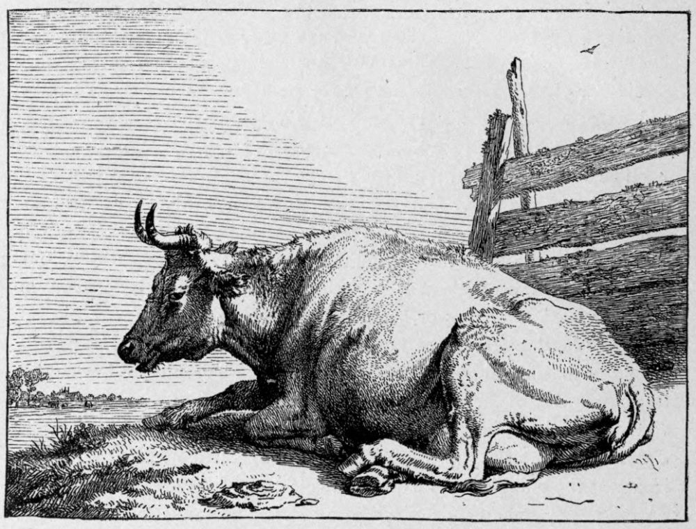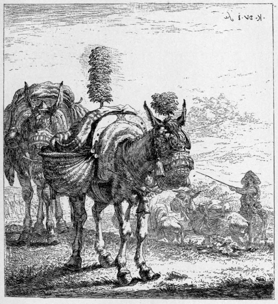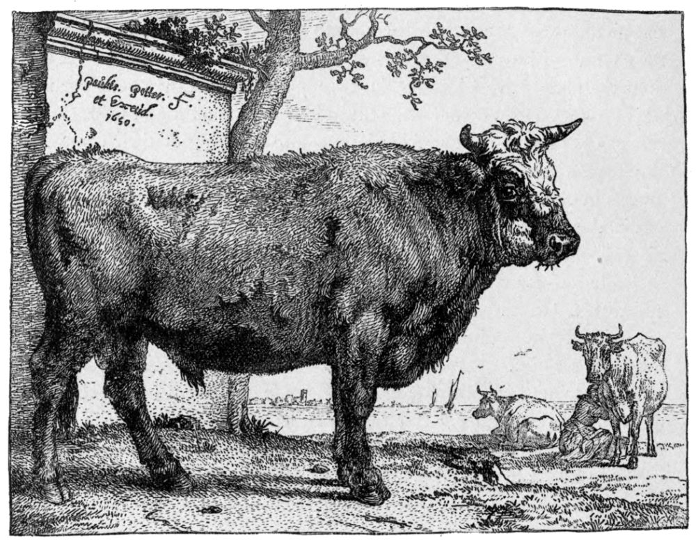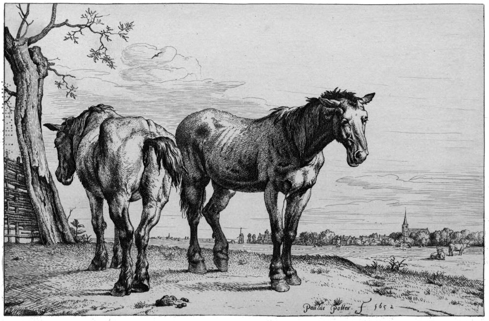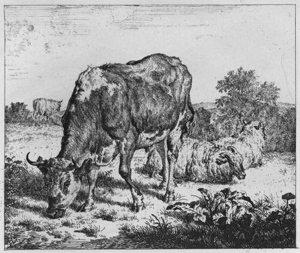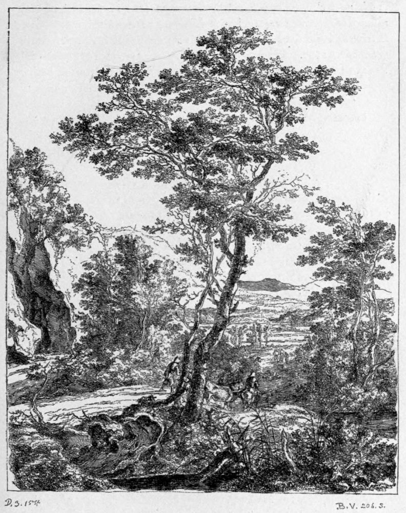 Yet the quantity of etched plates produced during this period in Holland is immense, and most of the best work was published within the same two or three decades. To take a single year, 1652, Potter’s studies of horses, a set of cattle by Berchem, several plates by Du Jardin, one of the finest pieces of Ostade, La Fileuse, appeared in it; while the year following saw the publication of Adriaen van de Velde’s largest etching, and Ruisdael’s Three Oaks had been issued but three years earlier. Rembrandt’s Tobit Blind is dated 1651, and the Three Crosses 1653. This great fecundity has been necessarily a source of some embarrassment to the writer; and though a number of minor men have been omitted, several etchers have been included, whom for the sake of completeness it was necessary to give some account of, but whom it is hard to make interesting, and about whom enthusiasm is impossible.