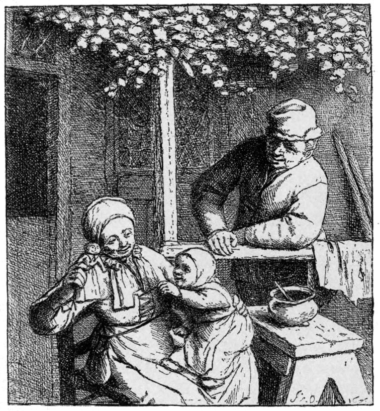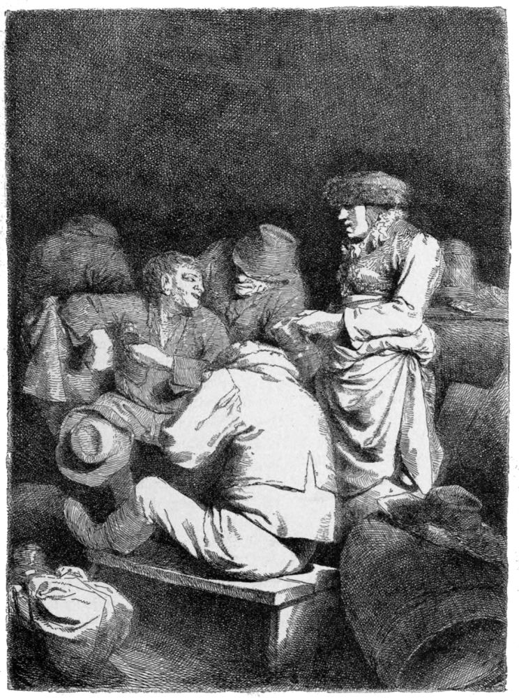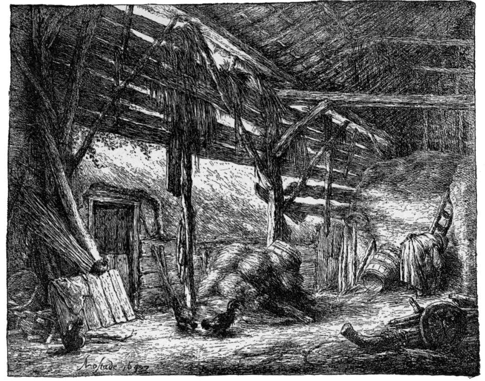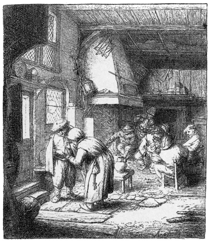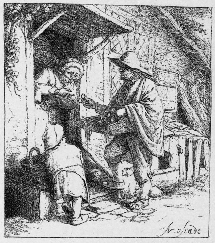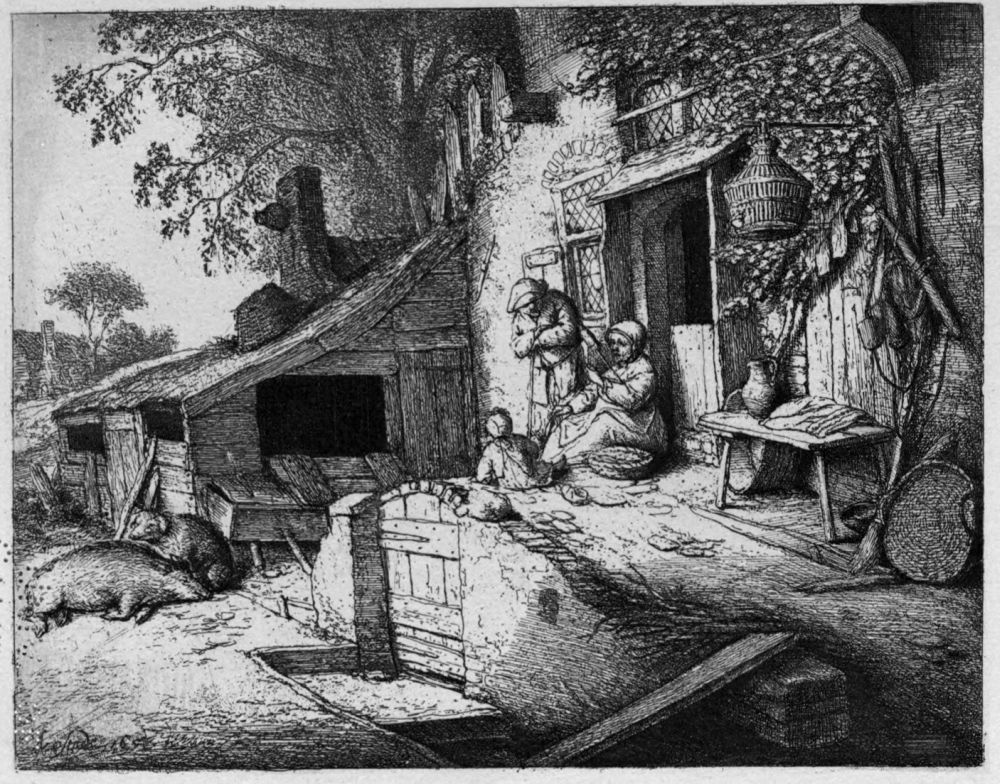 To this may possibly be added The Humpbacked Fiddler (B. 44).{24} Neither Bartsch nor Dutuit appears to have noticed a date on this plate; but it seems clear that it is there, following the signature, though obscured by lines. The writer inclines to decipher it as 1631 or 1651; but it is impossible to be positive on the point. These data would doubtless serve many critics with material for constructing a chronological list of the whole of the etchings. But this amusement shall be left to the reader. The etchings, as a matter of fact, do not present any marked variety of treatment. Ostade was not, like Rembrandt, a master of many styles; nor did he develop any particular style by continually surpassing his own successes. We can only say that he seems to have attained his greatest mastery in a middle period, about 1650. The Wife Spinning of 1652 is not followed by any dated piece that at all rivals it. The Cobbler of 1671, for instance, which was a failure in the first biting, betrays also a certain languor of handling, very different from the inexhaustible care and skill bestowed on the earlier plate.