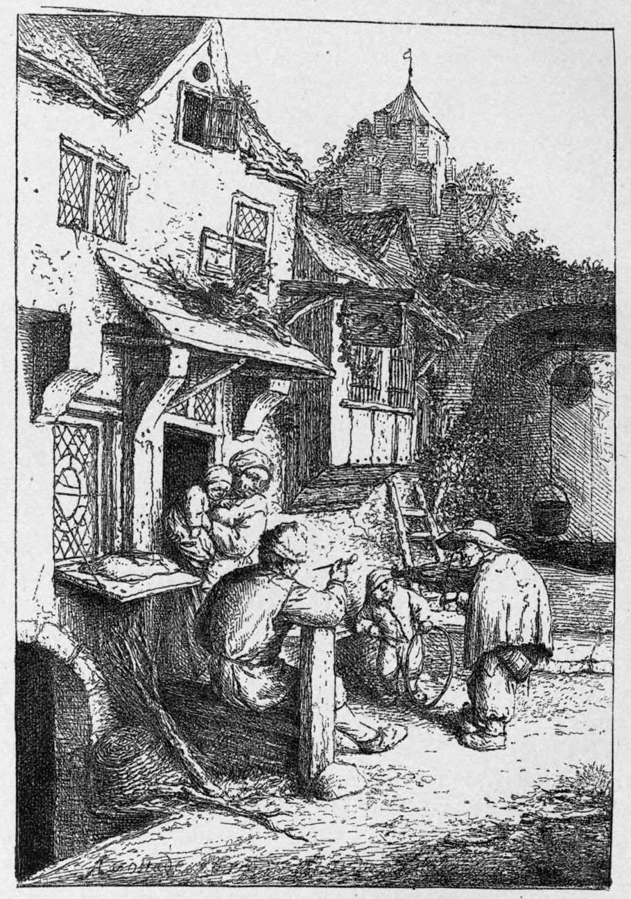 With most of the Dutch artists, etching was a subordinate accomplishment, and their work on copper is but a less interesting reflection of their work on canvas. This cannot be said of Ostade. As with Rembrandt, his etched work is the complement, rather than a supplement merely, of his painting. To the present writer, indeed, his etchings have more interest than his pictures. The latter are numerous; they may be seen in almost all galleries of importance, and the reader is doubtless familiar with their characteristics. Delightful as they often are, they do not rival those of Adriaen Brouwer, who was by four years Ostade’s senior, and who, though born a Fleming, worked mostly in Holland, and entered Hals’ studio at the same time. There are a few plates attributed to Brouwer; but, if genuine, these show that he never thoroughly mastered the technique of etching; none of them approaches the least successful plates of Ostade. Brouwer as a painter, on the other hand, surpasses beyond question all the painters of peasant life, whether of Holland or of Flanders.