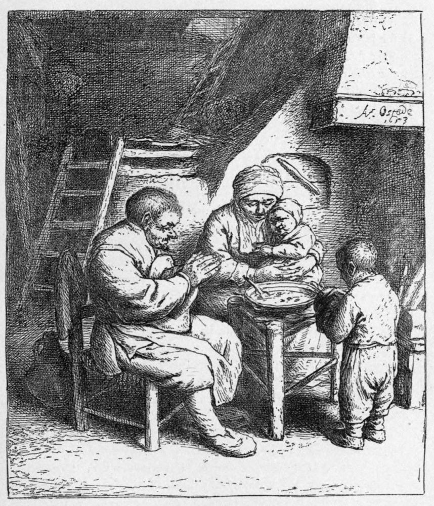 interest in the subject has not died out; he is alert for a new posture, a fresh touch, a livelier handling of some part of his design, that may im{23}prove the whole. In this case the drawing, which is of a different shape from the print and much broader, contains at the left the figure of a man seated and cutting a loaf of bread on his knees. Ostade felt that this figure disturbed the unity of the piece no less than the sense of home seclusion, and he omitted it from his work on the copper. This reveals the born etcher: one who works with directness, swiftness, passion; whose needle takes the impulse of his thought immediately, who never works in cold blood.