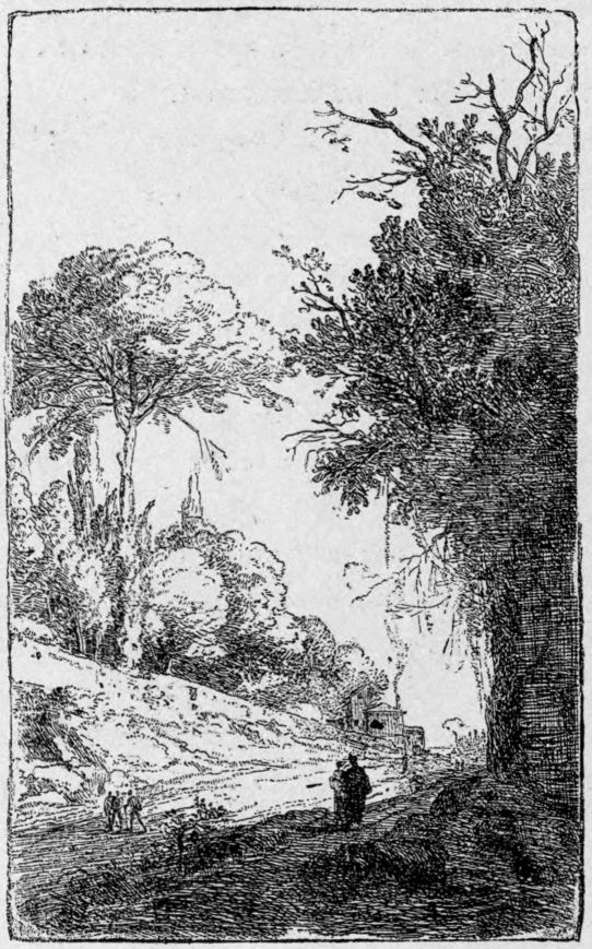 In 1627, however, Callot met, at Nancy, Claude Lorraine, and probably instructed him in etching. Claude left Nancy for Italy in the same year, and in the following year etched his first plates. Between 1630 and 1663, he published a considerable number, among them some of exquisite delicacy and beauty. And from these etchings many of the Dutchmen derive their inspiration; and Claude is said to have employed men like Swaneveldt, Andries Both, and Jan Miel for inserting figures in his landscapes.