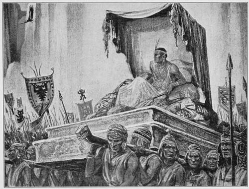 Long before sunrise of the appointed day the crowds began to make their way to the great plaza, where they took up their stations, silently and expectantly. The space had been divided into three sections, the limits of each of which was defined by a line of soldiers. In the first part, immediately in front of the palace, was a raised dais on which the coronation was to take place; it was covered with a fringed canopy of snowy cloth, and an enclosed passage led from it into the royal residence. On each side was a lower platform for the newly elected delegates of the people.