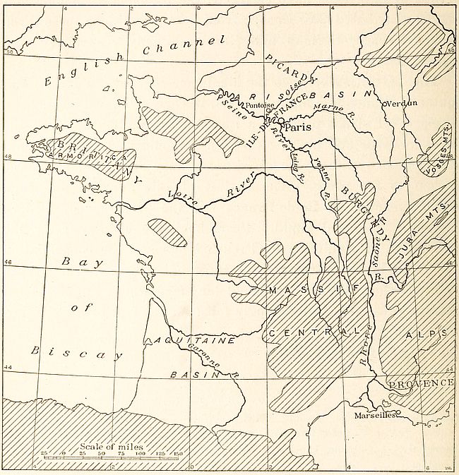 Take, as an example, the racial elements entering into the composition of French nationality. The dominating type, in northern France, belongs to the tall, narrow-headed Nordic race, with blue eyes and fair hair. Frenchmen with these characteristics are descendants of Franks and Gauls who settled in the northern plains of the Paris basin. In Brittany and the Massif Central, however, a round-headed and dark type, short and stockily built, is scattered over the two main piles of Archean mountains which still remain exposed to view. In the Aquitaine basin, as well as in the Lower Rhone valley, the narrow-headed Mediterranean race, with dark eyes and hair, is everywhere evident in the short, brunet inhabitants.