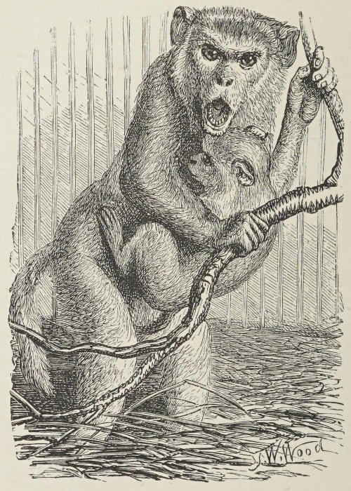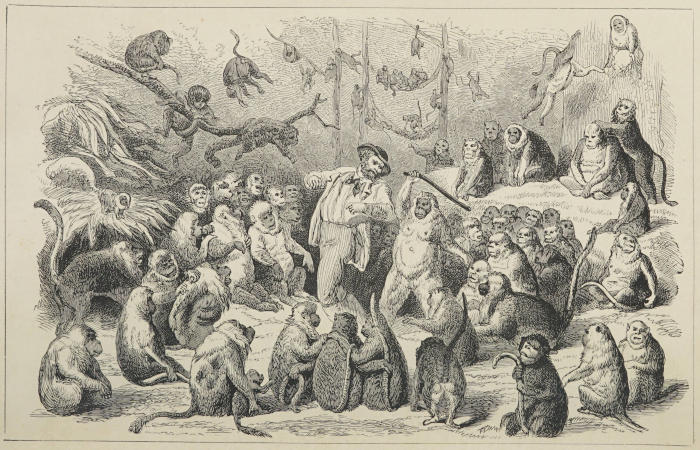 As apes are far more saleable animals when their natural talent for imitation is developed by the aid of education, I made a point of putting most of those in my collection through a course of instruction, the object of which was to render them more attractive and engaging in the eyes of intending purchasers. I taught them, for instance, to throw somersaults, to jump through hoops, to dance, to play the tambourine, to march, to fence, and to salute in approved military style. Many among them, I admit, were unwilling scholars, and chafed and fretted under the tuition they received; some so much so, indeed, that, as is commonly the case with members of the human family, they could only be persuaded to prosecute their studies by the lively fear of a little wholesome correction. All this, however, arose simply from their not knowing so well as I did what was really for their own advantage.