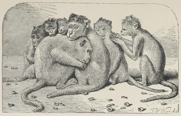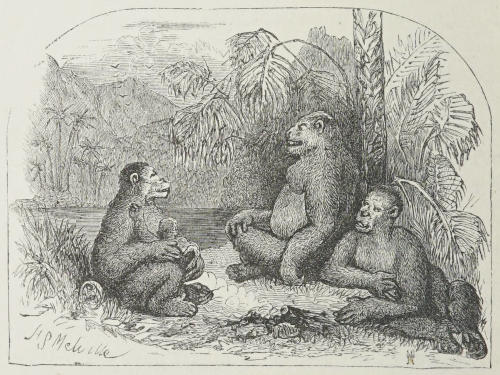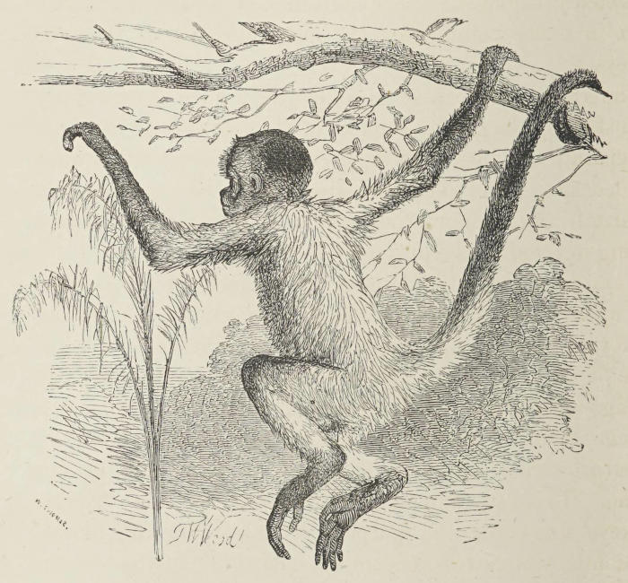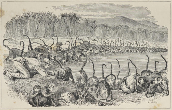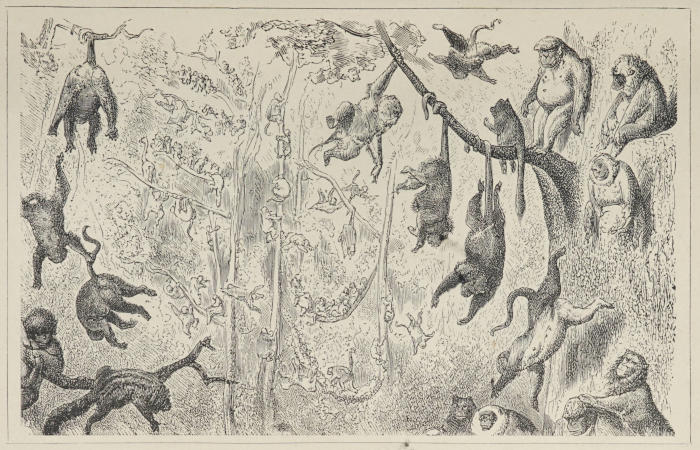 | Clouds upon clouds of apes, of all forms, colours, and sizes, clambering up the trees, rolling themselves among the branches like squirrels, or taking possession of the ground about me | 30 |