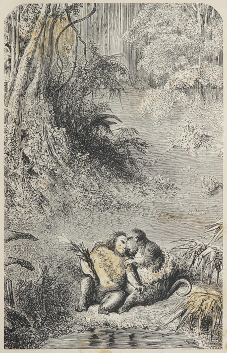 | The court-martial breaks up.—I secretly follow the members of it.—I distinguish some houses between the trees, and believe myself to be at last among my fellow-men.—My hopes are crushed by discovering the devastated condition of the settlement.—I meet with Saïmira and Mococo, the latter in captivity.—I recognise in the president of the court-martial one of my two baboons of Macao.—This discovery troubles me, the more so when I find that Karabouffi’s power is supreme.—Foreseeing the peril I should be in if recognised by him, I hide myself in a grotto.—I am visited by Saïmira.—Weariness becomes at length more intolerable than danger.—The light already seen reappears.—I leave my retreat in search of it | Page 66 |