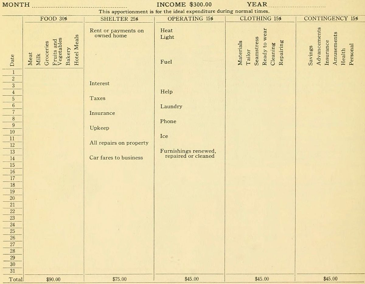 Every home maker has a cherished ideal for the various members of her family. The rapidity with which that dream is realized depends upon how the family income and individual energy are used. To those who have never kept a record of expenditures, the first definite step toward establishing a substantial financial basis and assuring progress to the family is the keeping of an expense account. Each day, make an accurate accounting of all expenditures. Keep this carefully for four months, then, with that account as a basis, plan your expenditures for the next four months and live within that plan. The third quarter, keep your expense account again and then you will have the accurate information regarding the financial needs of your particular family. After a careful analysis, make up a year’s budget, cutting down non-essentials and adding to accounts that really mean an advance step toward your goal.