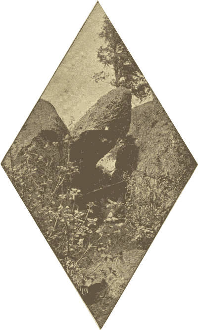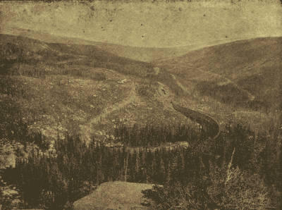 Speeding across and down the south side of the Divide, I notice trespassers on a part of my whilom wild estate under the foot-hills at the right.[Pg 20] Specks of cottages perched upon the slope of one of my glades do not add to the romance of the picture, yet I feel a bit flattered in that the builders have exhibited good taste in selecting a location for their brown-roofed boxes. They can be cool in summer and enjoy a view of mountains and plains. Then they may speculate, too, upon what preceded the pines and grass-covered earth about them. The gorge just back of them, and the meagre creek tumbling out from it, give a hint, and as we move quickly down the narrow valley dolmens here and there indicate that the little creek is only the remains of a river of ice. These monuments of the centuries are very abundant hereabouts. I have seen fossilized bivalves from this same drift down which I am speeding, and am set to wondering what kind of mortals inhabited these shores when those oysters were growing, and whether the brown-roofed cottages on the slope above are an improvement upon the architecture of that epoch. Or how many millions of years preceding that ice and ocean age this same valley was a bed of verdure, as now; and whether those who stirred up the soil are permitted to look on us and whether they do so in sympathy with us in our tragedies, or are our tragedies all comedies to them?