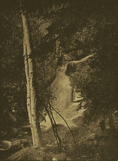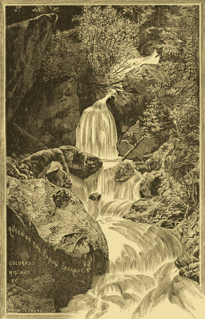 The mountain is not visible from Cascade, the initial point of the road; the intervening hills shut it out. Starting thence we follow the Fountain up a very little distance, then turn to the left along the face of the first hill, then to the right, and so winding our way for two miles we reach the vicinity of the Grotto in Cascade Cañon. In a direct line we are half a mile from the starting-point. Over and through the pines that sparsely cover the mountain side, and over beds of wild flowers that carpet the slope, we can, before this distance is accomplished, obtain a fair view of the valley of the Fountain, Cascade and Manitou, thence out on to the broad plains, rising blue and dim until they kiss the horizon. One does not look for valleys in the mountain tops, but a mountain top reached is still further surmounted, and the road winds through aspen glades and the air is freighted with the odor of pines.