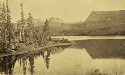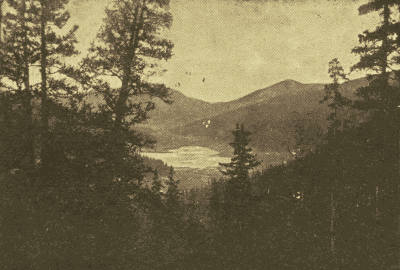 The air grows warmer as we go on. Above the Peak a few clouds are hovering, and I notice above the summits of the lower mountains two long, slender clouds of a deadwood color. Presently these join at one end, and soon the other ends swing together and form an oval with a stretch of blue between, and there is a lake above the horizon. It requires no stretch of the imagination; on the contrary, I find I am compelled to satisfy[Pg 15] my mind that one part of the cloud must be above the other, else the highest is the near shore, in the plane of my vision, and I look across a sheet of blue water to the farther side. An irregular rift in one place makes a cove, and on the bank is a cabin, and around the edges is fallen timber. Thanks to the absent winds, I am for twenty minutes or more treated to this view of a lake and its wooded surroundings, made of a strip of blue sky and a cloud.