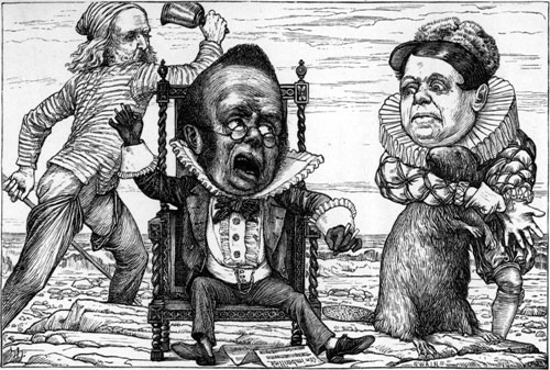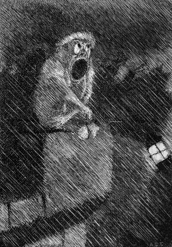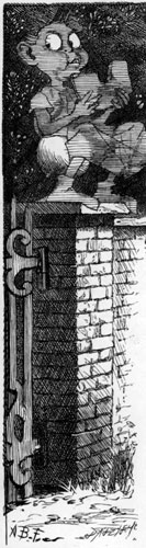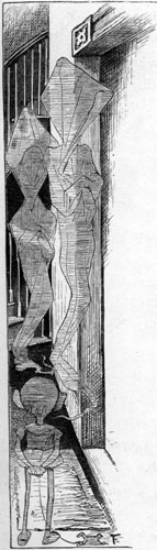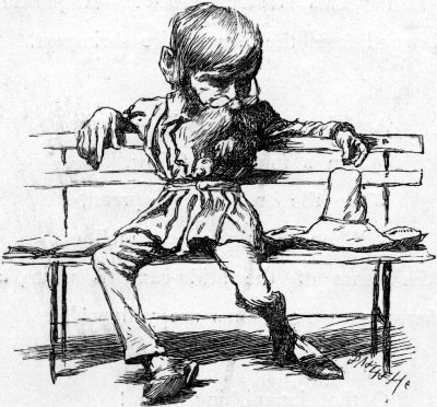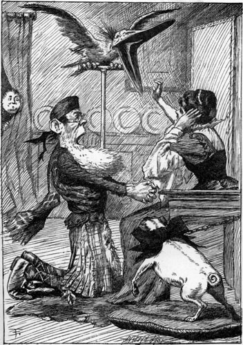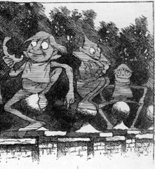| They sought it with thimbles, they sought it with care; They pursued it with forks and hope; They threatened its life with a railway-share; They charmed it with smiles and soap. And the Banker, inspired with a courage so new It was matter for general remark, Rushed madly ahead and was lost to their view In his zeal to discover the Snark. But while he was seeking with thimbles and care, A Bandersnatch swiftly drew nigh And grabbed at the Banker, who shrieked in despair, For he knew it was useless to fly. [Pg 174] He offered large discount—he offered a cheque (Drawn “to bearer”) for seven-pounds-ten: But the Bandersnatch merely extended its neck And grabbed at the Banker again. Without rest or pause—while those frumious jaws Went savagely snapping around— He skipped and he hopped, and he floundered and flopped, Till fainting he fell to the ground. The Bandersnatch fled as the others appeared Led on by that fear-stricken yell: And the Bellman remarked “It is just as I feared!” And solemnly tolled on his bell. He was black in the face, and they scarcely could trace The least likeness to what he had been: While so great was his fright that his waistcoat turned white— A wonderful thing to be seen! |