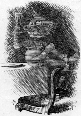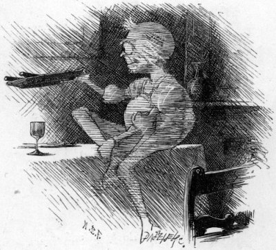 | “Port-wine, he says, when rich and sound, Warms his old bones like nectar: And as the inns, where it is found, Are his especial hunting-ground, We call him the Inn-Spectre.” I bore it—bore it like a man— This agonizing witticism! And nothing could be sweeter than My temper, till the Ghost began Some most provoking criticism. “Cooks need not be indulged in waste; Yet still you’d better teach them Dishes should have some sort of taste. Pray, why are all the cruets placed Where nobody can reach them? “That man of yours will never earn His living as a waiter! Is that queer thing supposed to burn? (It’s far too dismal a concern To call a Moderator). [Pg 23] “The duck was tender, but the peas Were very much too old: And just remember, if you please, The next time you have toasted cheese, Don’t let them send it cold. “You’d find the bread improved, I think, By getting better flour: And have you anything to drink That looks a little less like ink, And isn’t quite so sour?” Then, peering round with curious eyes, He muttered “Goodness gracious!” And so went on to criticise— “Your room’s an inconvenient size: It’s neither snug nor spacious. “That narrow window, I expect, Serves but to let the dusk in—” “But please,” said I, “to recollect ’Twas fashioned by an architect Who pinned his faith on Ruskin!” [Pg 24] “I don’t care who he was, Sir, or On whom he pinned his faith! Constructed by whatever law, So poor a job I never saw, As I’m a living Wraith! “What a re-markable cigar! How much are they a dozen?” I growled “No matter what they are! You’re getting as familiar As if you were my cousin! “Now that’s a thing I will not stand, And so I tell you flat.” “Aha,” said he, “we’re getting grand!” (Taking a bottle in his hand) “I’ll soon arrange for that!” And here he took a careful aim, And gaily cried “Here goes!” I tried to dodge it as it came, But somehow caught it, all the same, Exactly on my nose. [Pg 25] And I remember nothing more That I can clearly fix, Till I was sitting on the floor, Repeating “Two and five are four, But five and two are six.” What really passed I never learned, Nor guessed: I only know That, when at last my sense returned, The lamp, neglected, dimly burned— The fire was getting low— Through driving mists I seemed to see A Thing that smirked and smiled: And found that he was giving me A lesson in Biography, As if I were a child. |