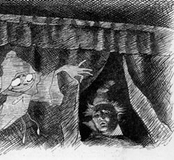 | To the horror of all who were present that day, He uprose in full evening dress, And with senseless grimaces endeavoured to say What his tongue could no longer express. Down he sank in a chair—ran his hands through his hair— And chanted in mimsiest tones Words whose utter inanity proved his insanity, While he rattled a couple of bones. “Leave him here to his fate—it is getting so late!” The Bellman exclaimed in a fright. “We have lost half the day. Any further delay, And we sha’n’t catch a Snark before night!” |