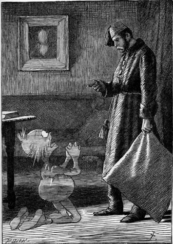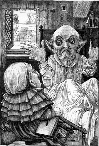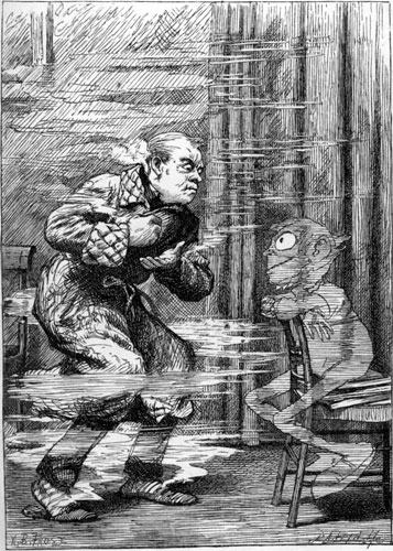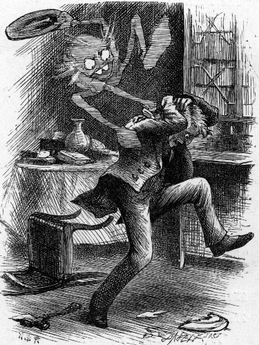 | “For, though they claim to be exempt From pride, they treat a Phantom As something quite beneath contempt— Just as no Turkey ever dreamt Of noticing a Bantam.” [Pg 20] “They seem too proud,” said I, “to go To houses such as mine. Pray, how did they contrive to know So quickly that ‘the place was low,’ And that I ‘kept bad wine’?” “Inspector Kobold came to you—” The little Ghost began. Here I broke in—“Inspector who? Inspecting Ghosts is something new! Explain yourself my man!” “His name is Kobold,” said my guest: “One of the Spectre order: You’ll very often see him dressed In a yellow gown, a crimson vest, And a night-cap with a border. “He tried the Brocken business first, But caught a sort of chill; So came to England to be nursed, And here it took the form of thirst, Which he complains of still. |