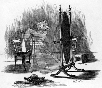 | “By day, if he should be alone— At home or on a walk— You merely give a hollow groan, To indicate the kind of tone In which you mean to talk. “But if you find him with his friends, The thing is rather harder. In such a case success depends On picking up some candle-ends, Or butter, in the larder. “With this you make a kind of slide (It answers best with suet), On which you must contrive to glide, And swing yourself from side to side— One soon learns how to do it. “The Second tells us what is right In ceremonious calls:— ‘First burn a blue or crimson light’ (A thing I quite forgot to-night), ‘Then scratch the door or walls.’” |
