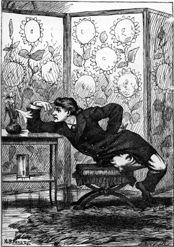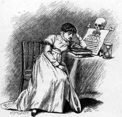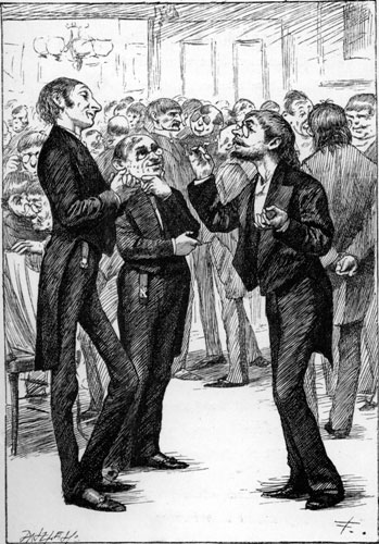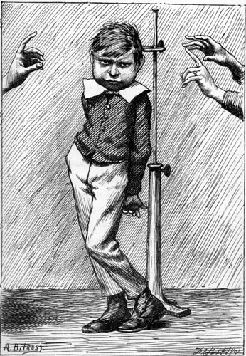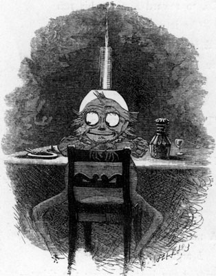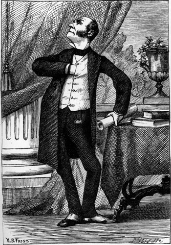 | Yet what are all such gaieties to me Whose thoughts are full of indices and surds? x2 + 7x + 53 = 11⁄3. But something whispered “It will soon be done: Bands cannot always play, nor ladies smile: Endure with patience the distasteful fun For just a little while!” A change came o’er my Vision—it was night: We clove a pathway through a frantic throng: The steeds, wild-plunging, filled us with affright: The chariots whirled along. Within a marble hall a river ran— A living tide, half muslin and half cloth: And here one mourned a broken wreath or fan, Yet swallowed down her wrath; [Pg 204] And here one offered to a thirsty fair (His words half-drowned amid those thunders tuneful) Some frozen viand (there were many there), A tooth-ache in each spoonful. There comes a happy pause, for human strength Will not endure to dance without cessation; And every one must reach the point at length Of absolute prostration. At such a moment ladies learn to give, To partners who would urge them over-much, A flat and yet decided negative— Photographers love such. There comes a welcome summons—hope revives, And fading eyes grow bright, and pulses quicken: Incessant pop the corks, and busy knives Dispense the tongue and chicken. Flushed with new life, the crowd flows back again: And all is tangled talk and mazy motion— Much like a waving field of golden grain, Or a tempestuous ocean. [Pg 205] And thus they give the time, that Nature meant For peaceful sleep and meditative snores, To ceaseless din and mindless merriment And waste of shoes and floors. And One (we name him not) that flies the flowers, That dreads the dances, and that shuns the salads, They doom to pass in solitude the hours, Writing acrostic-ballads. How late it grows! The hour is surely past That should have warned us with its double-knock? The twilight wanes, and morning comes at last— “Oh, Uncle, what’s o’clock?” The Uncle gravely nods, and wisely winks. It may mean much, but how is one to know? He opes his mouth—yet out of it, methinks, No words of wisdom flow. |