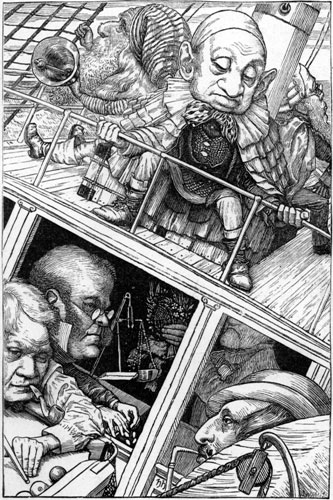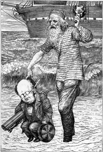 | “Other maps are such shapes, with their islands and capes! But we’ve got our brave Captain to thank” (So the crew would protest) “that he’s bought us the best— A perfect and absolute blank!” This was charming, no doubt: but they shortly found out That the Captain they trusted so well Had only one notion for crossing the ocean, And that was to tingle his bell. He was thoughtful and grave—but the orders he gave Were enough to bewilder a crew. When he cried “Steer to starboard, but keep her head larboard!” What on earth was the helmsman to do? Then the bowsprit got mixed with the rudder sometimes: A thing, as the Bellman remarked, That frequently happens in tropical climes, When a vessel is, so to speak, “snarked.” But the principal failing occurred in the sailing, And the Bellman, perplexed and distressed, [Pg 145]Said he had hoped, at least, when the wind blew due East, That the ship would not travel due West! But the danger was past—they had landed at last, With their boxes, portmanteaus, and bags: Yet at first sight the crew were not pleased with the view Which consisted of chasms and crags. The Bellman perceived that their spirits were low, And repeated in musical tone Some jokes he had kept for a season of woe— But the crew would do nothing but groan. He served out some grog with a liberal hand, And bade them sit down on the beach: And they could not but own that their Captain looked grand, As he stood and delivered his speech. “Friends, Romans, and countrymen, lend me your ears! (They were all of them fond of quotations: So they drank to his health, and they gave him three cheers While he served out additional rations). [Pg 146] “We have sailed many months, we have sailed many weeks, (Four weeks to the month you may mark), But never as yet (’tis your Captain who speaks) Have we caught the least glimpse of a Snark! “We have sailed many weeks, we have sailed many days, (Seven days to the week I allow), But a Snark, on the which we might lovingly gaze, We have never beheld till now! “Come, listen, my men, while I tell you again The five unmistakable marks By which you may know, wheresoever you go, The warranted genuine Snarks. “Let us take them in order. The first is the taste, Which is meagre and hollow, but crisp: Like a coat that is rather too tight in the waist, With a flavour of Will-o-the wisp. “Its habit of getting up late you’ll agree That it carries too far, when I say That it frequently breakfasts at five o’clock tea, And dines on the following day. [Pg 147] “The third is its slowness in taking a jest. Should you happen to venture on one, It will sigh like a thing that is deeply distressed: And it always looks grave at a pun. “The fourth is its fondness for bathing-machines, Which it constantly carries about, And believes that they add to the beauty of scenes— A sentiment open to doubt. “The fifth is ambition. It next will be right To describe each particular batch: Distinguishing those that have feathers, and bite, From those that have whiskers, and scratch. “For, although common Snarks do no manner of harm, Yet I feel it my duty to say Some are Boojums—” The Bellman broke off in alarm, For the Baker had fainted away. |